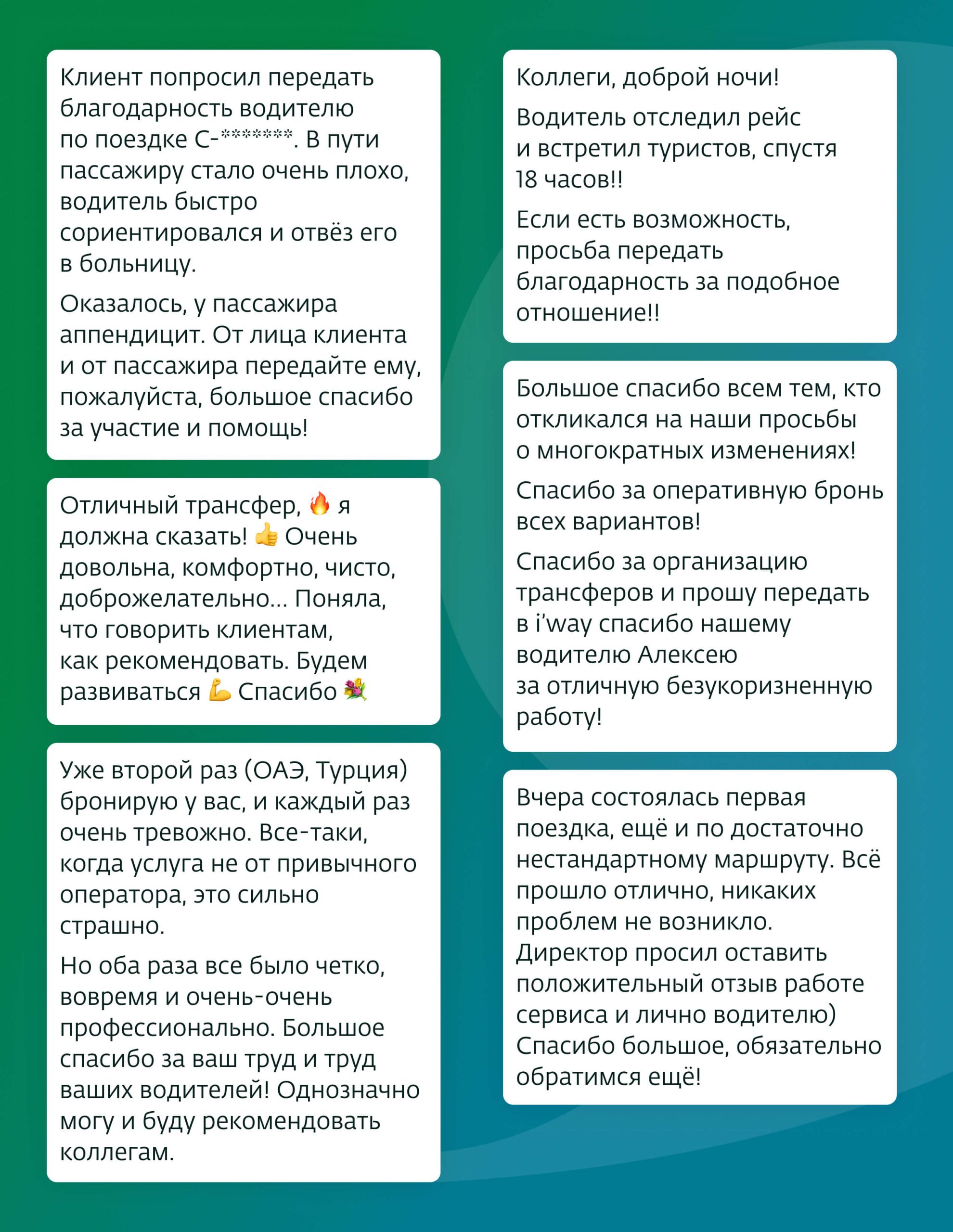 А ещё организовывали трансферы для хоккейных команд, хоров, актёров Мариинского театра, врачей, журналистов, иностранных делегаций, мэров, чиновников, владельцев компаний и футбольных клубов.