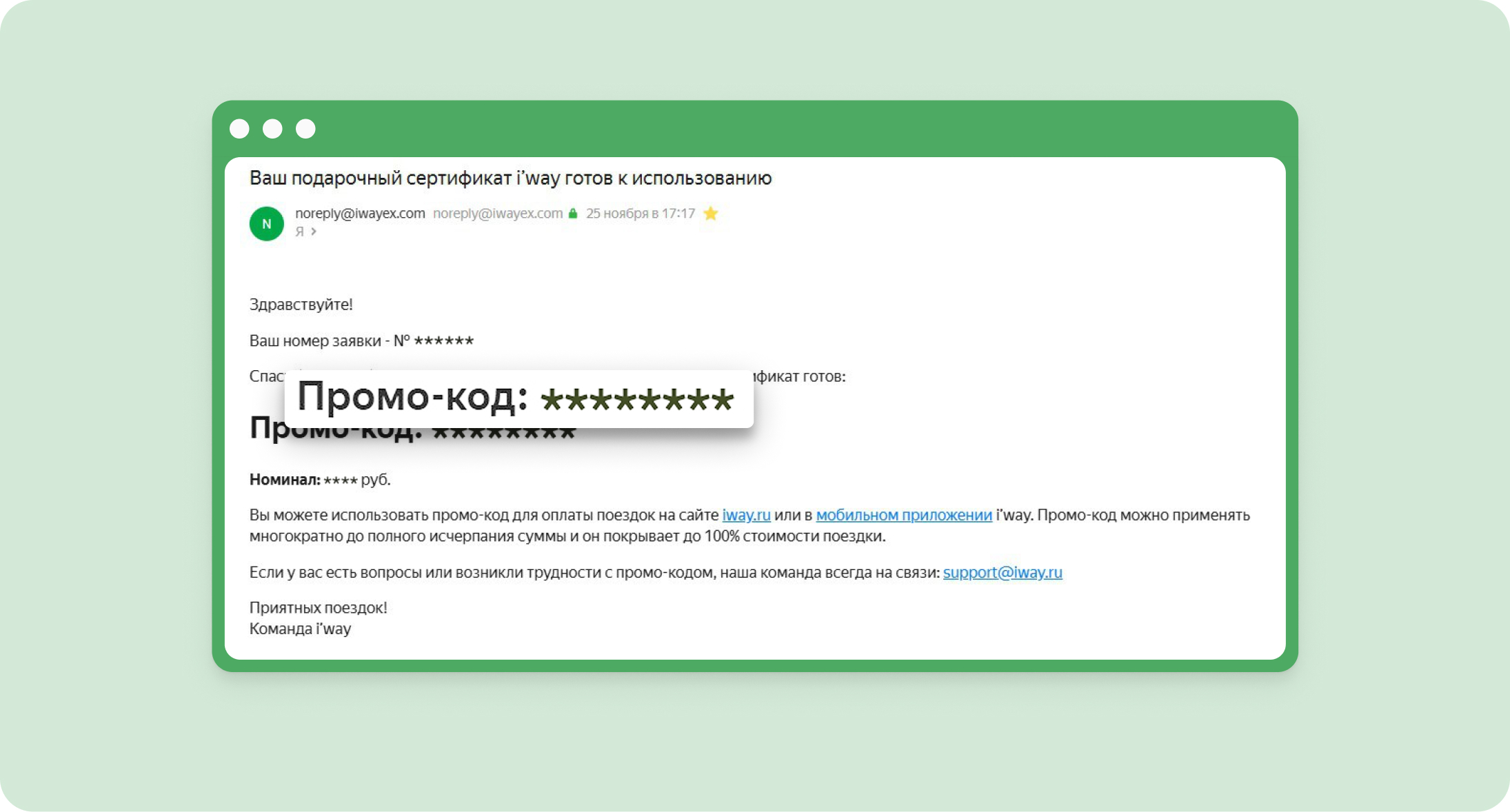 Чтобы воспользоваться сертификатом, скопируйте промокод из письма и вставьте в поле «промокод» при оформлении заказа.